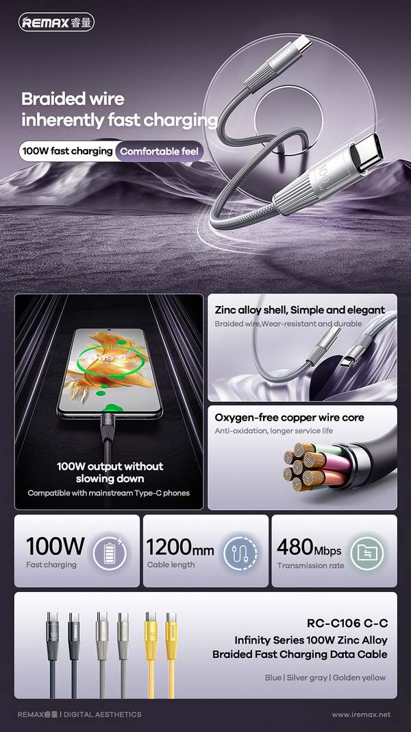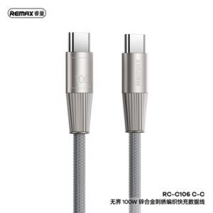 Cáp sạc nhanh truyền dữ liệu REMAX RC-C106 1.2M 100W có thiết kế mới: cáp bện dây dù, đầu dây bọc hợp kim kẽm chất lượng cao giúp tránh được rối, gãy gập và thuận tiện cũng như bền hơn trong quá trình sử dụng hàng ngày.