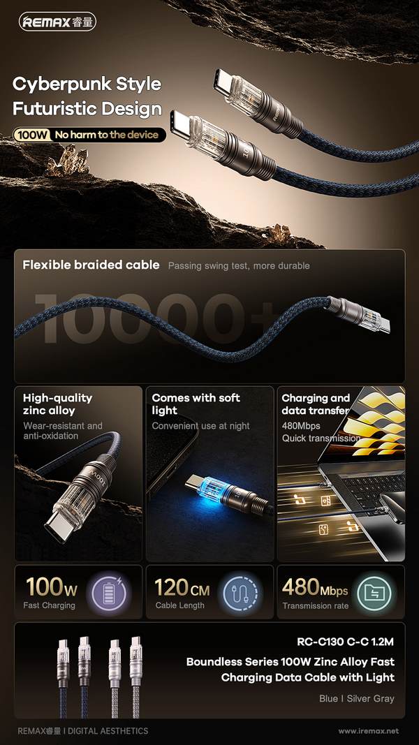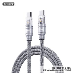 Cáp sạc nhanh truyền dữ liệu REMAX RC-C130 C-C có thiết kế mới: cáp bện dây dù, đầu dây bọc hợp kim kẽm chất lượng cao đi kèm ánh sáng dịu nhẹ giúp tránh được rối, gãy gập và thuận tiện cũng như bền hơn trong quá trình sử dụng hàng ngày.