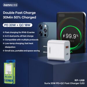 Củ sạc nhanh REMAX RP-U68 EU/US 20W PD+QC USB+Type C