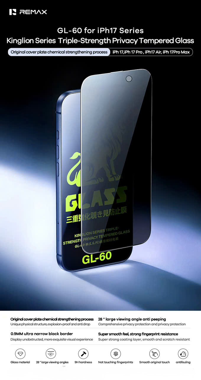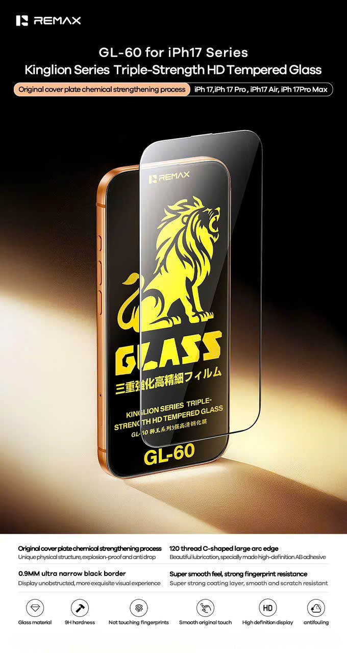 Kính cường lực REMAX Kinglion Series GL-60 được thiết kế với công nghệ Triple-Strength – gấp ba lần độ bền so với kính thường, giúp bảo vệ màn hình tối ưu trước va đập và trầy xước. Bề mặt HD trong suốt, cảm ứng mượt mà, hiển thị sắc nét như màn hình gốc. Thiết kế siêu mỏng, bo cong 2.5D ôm khít viền máy, mang lại cảm giác sang trọng và bảo vệ toàn di