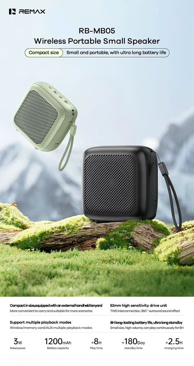 Loa Bluetooth Remax RB-MB05 là chiếc loa di động nhỏ gọn nhưng mạnh mẽ, mang đến âm thanh sống động và chân thực trong mọi không gian. Thiết kế hiện đại, tinh tế cùng lớp vỏ chắc chắn giúp RB-MB05 dễ dàng mang theo khi di chuyển. Loa hỗ trợ kết nối Bluetooth ổn định, cho phép phát nhạc không dây mượt mà từ điện thoại, máy tính bảng hay laptop. Dung lượng pin bền bỉ cho thời gian nghe nhạc dài, lý tưởng cho các buổi dã ngoại hoặc sử dụng hàng ngày.