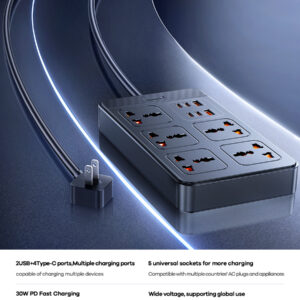 2. 5 ổ cắm đa năng, công suất 2500W, có thể sử dụng các thiết bị sạc phích cắm đa quốc gia; Được trang bị công tắc nguồn và đèn báo, dễ dàng biết được liệu ổ cắm điện có được cấp nguồn hay không