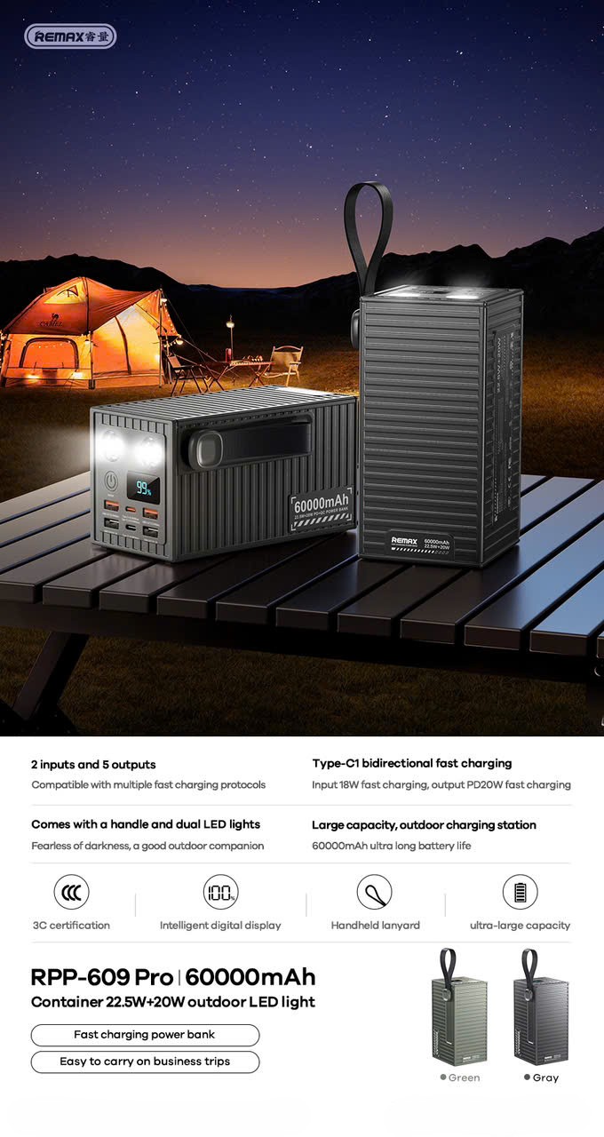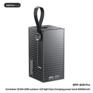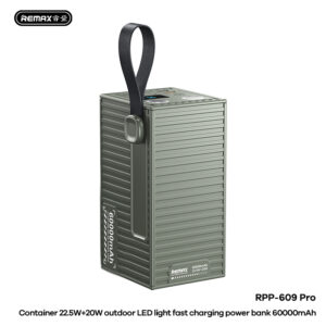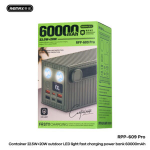 Pin dự phòng REMAX RPP-609 Pro Container dung lượng lớn 60.000mAh, hỗ trợ sạc nhanh 22.5W + 20W, đáp ứng nhu cầu sạc nhiều thiết bị cùng lúc. Thiết kế chắc chắn, bền bỉ, tích hợp đèn LED ngoài trời, tiện lợi cho dã ngoại, du lịch và những chuyến đi dài.