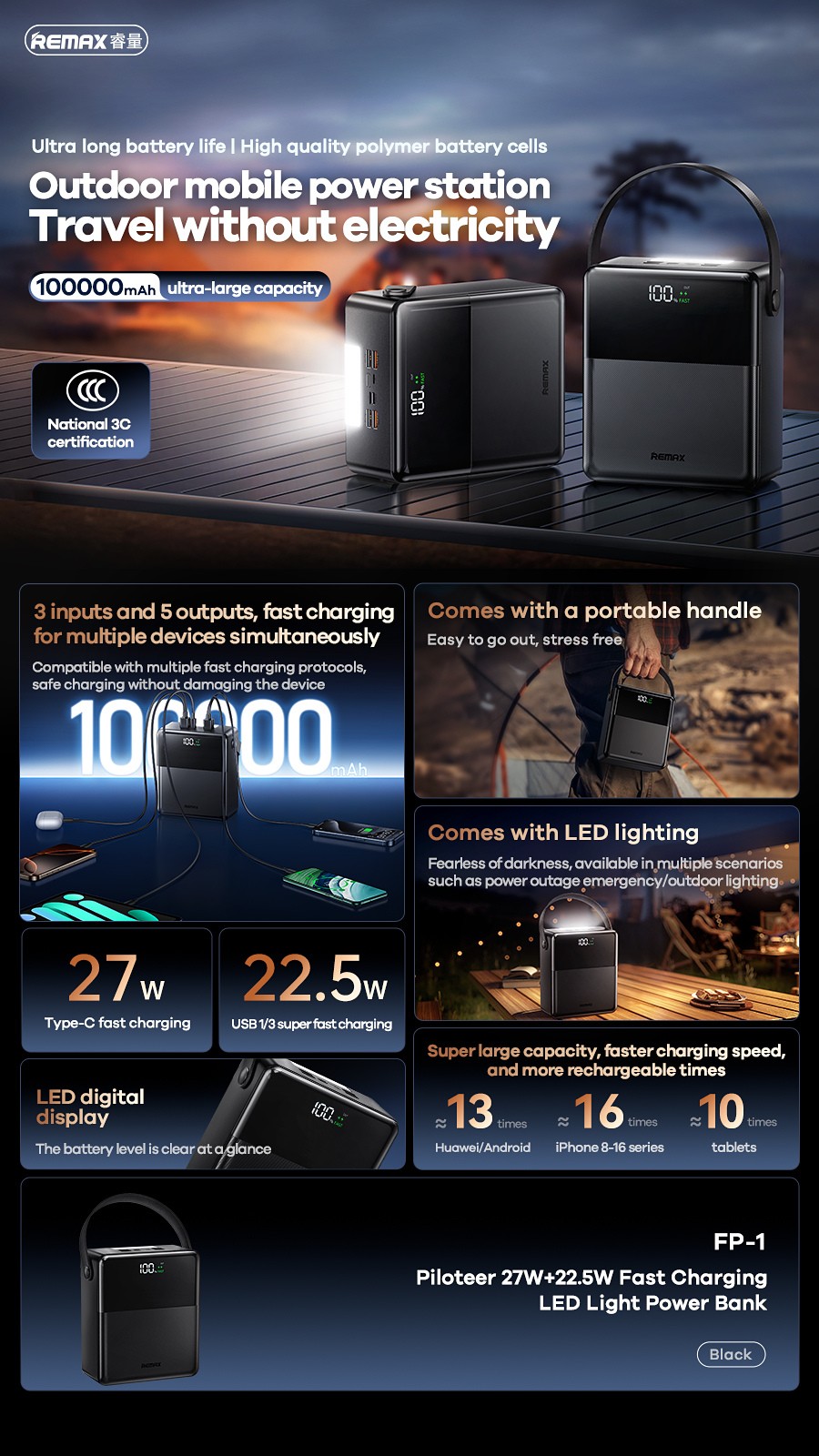 Pin dự phòng dung lượng lớn REMAX Piloteer Series 27W + 22.5W LED Lamp Fast Charging Power Bank 100000mAh FP-1