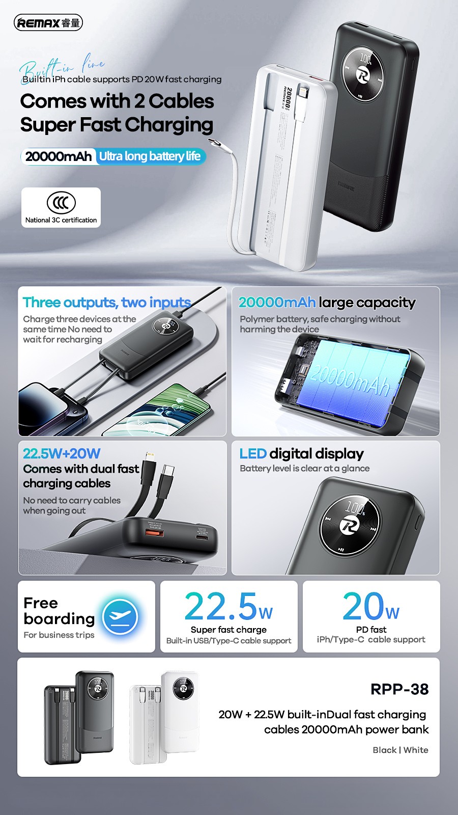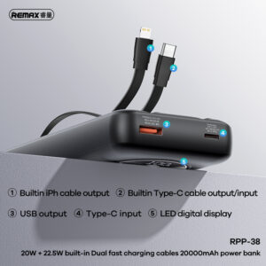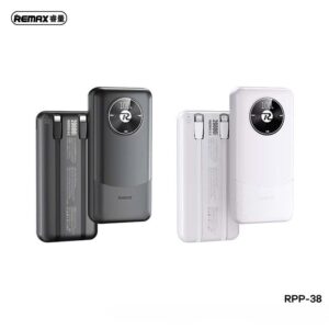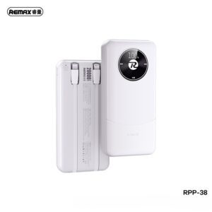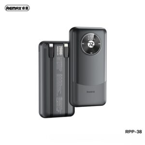 Pin dự phòng REMAX RPP-38 dung lượng 20.000mAh, hỗ trợ sạc nhanh 20W + 22.5W, tích hợp 2 cáp sạc nhanh tiện lợi. Thiết kế gọn gàng, hiện đại, dễ mang theo, đáp ứng nhu cầu sạc đa thiết bị mọi lúc mọi nơi.