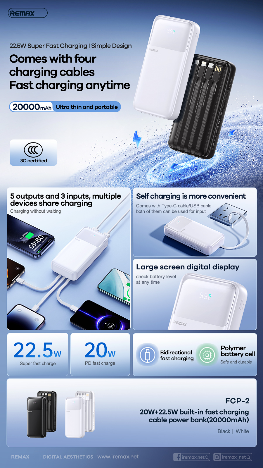 Pin dự phòng Remax FCP-2 20000mAh 20W+22.5W Fast Charging Cable Power Bank là một sản phẩm sạc dự phòng cao cấp của Remax, thiết kế với công suất mạnh mẽ và nhiều tính năng hiện đại, đáp ứng nhu cầu sạc cho các thiết bị di động của bạn một cách nhanh chóng và hiệu quả.