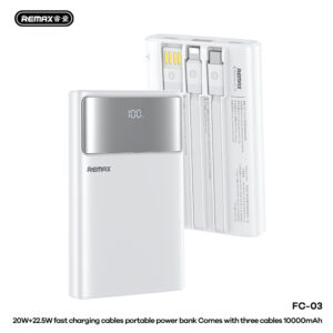 Pin dự phòng REMAX FC-03 dung lượng 10000mAh được thiết kế nhỏ gọn, hiện đại, tích hợp sẵn dây sạc nhanh 20W + 22.5W, hỗ trợ nhiều thiết bị di động, là lựa chọn phù hợp cho người dùng thường xuyên di chuyển.