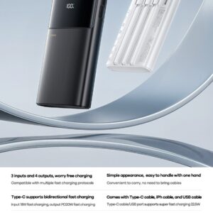 - Type-C hỗ trợ sạc nhanh hai chiều, với đầu vào sạc nhanh 18W và đầu ra sạc nhanh PD20W; cáp Type-C hỗ trợ sạc siêu nhanh 22.5W và tương thích với sạc nhanh PD20W; USB hỗ trợ sạc siêu nhanh 22.5W