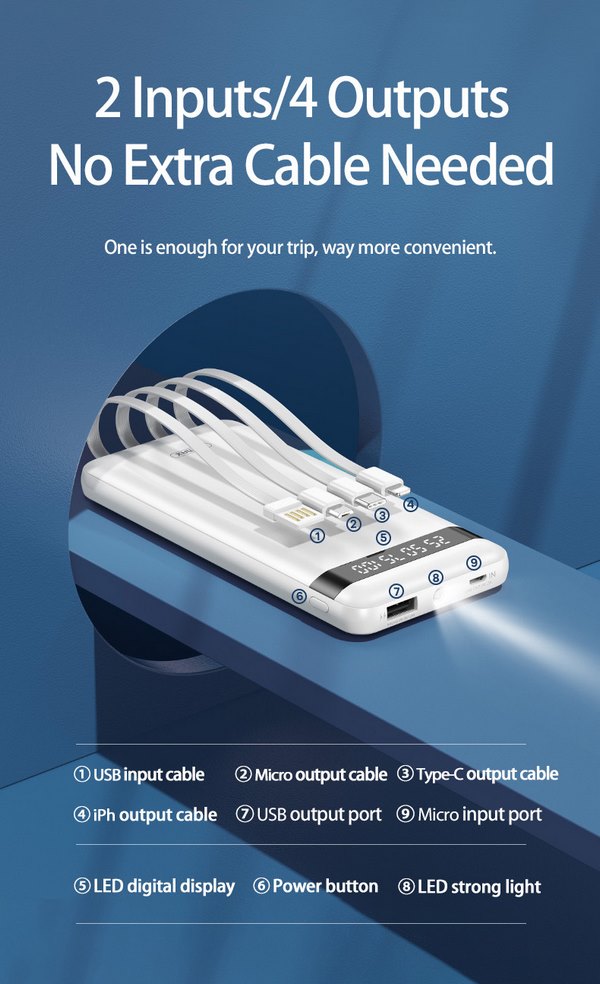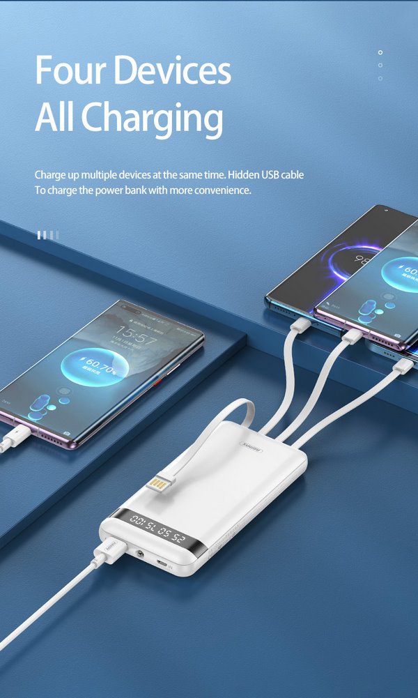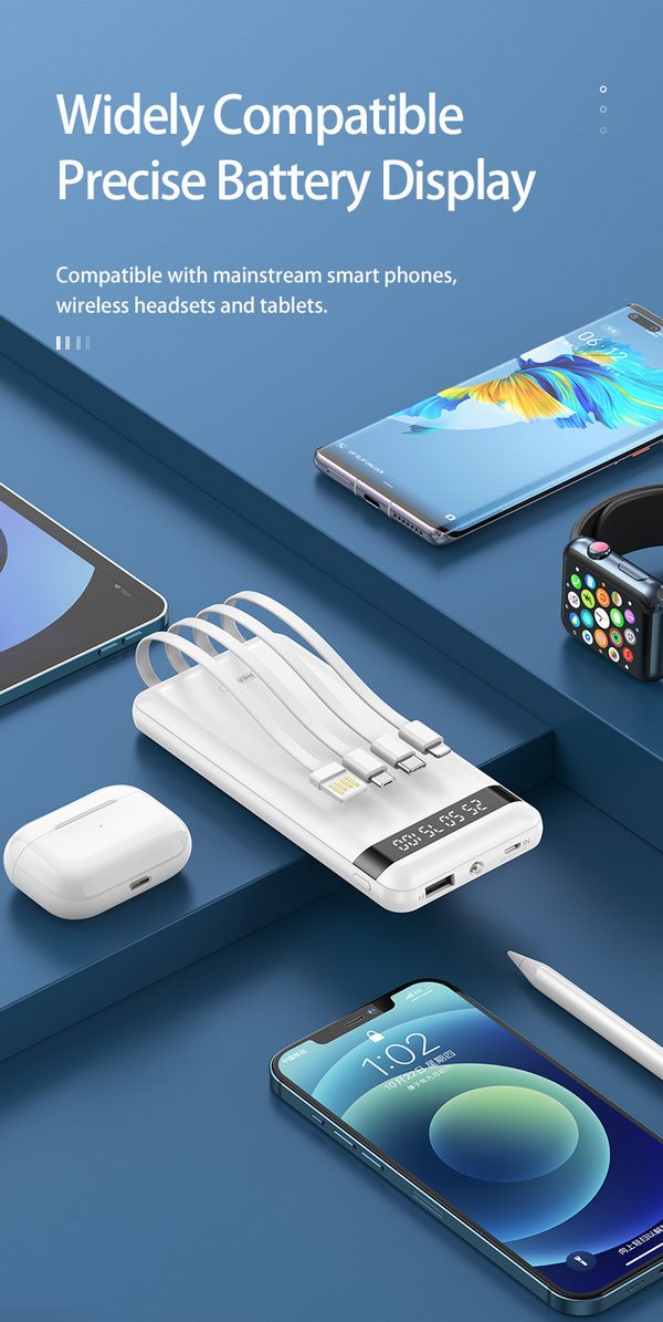 Với khả năng tương thích phổ biến kết nối Micro (đầu vào) và 1 USB + 3 cáp Lightning, Type C, Micro (4 đầu ra) rất linh hoạt, giúp pin phù hợp và đáp ứng nhu cầu sạc của mọi loại thiết bị.