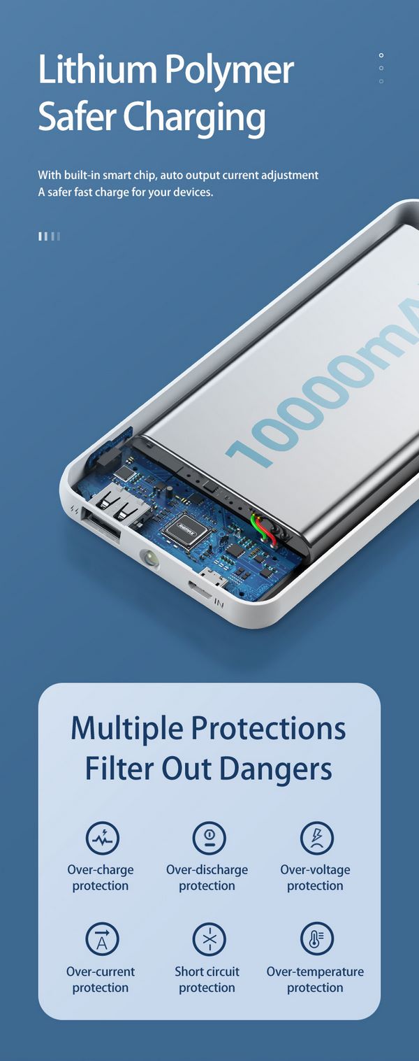Với vật liệu chống cháy polymer và kỹ thuật sản xuất tiên tiến, pin sạc dự phòng REMAX RPP-222 10000mAh giúp sạc không bị quá nóng đảm bảo độ bền cao và hiệu suất ổn định trong suốt quá trình sử dụng.