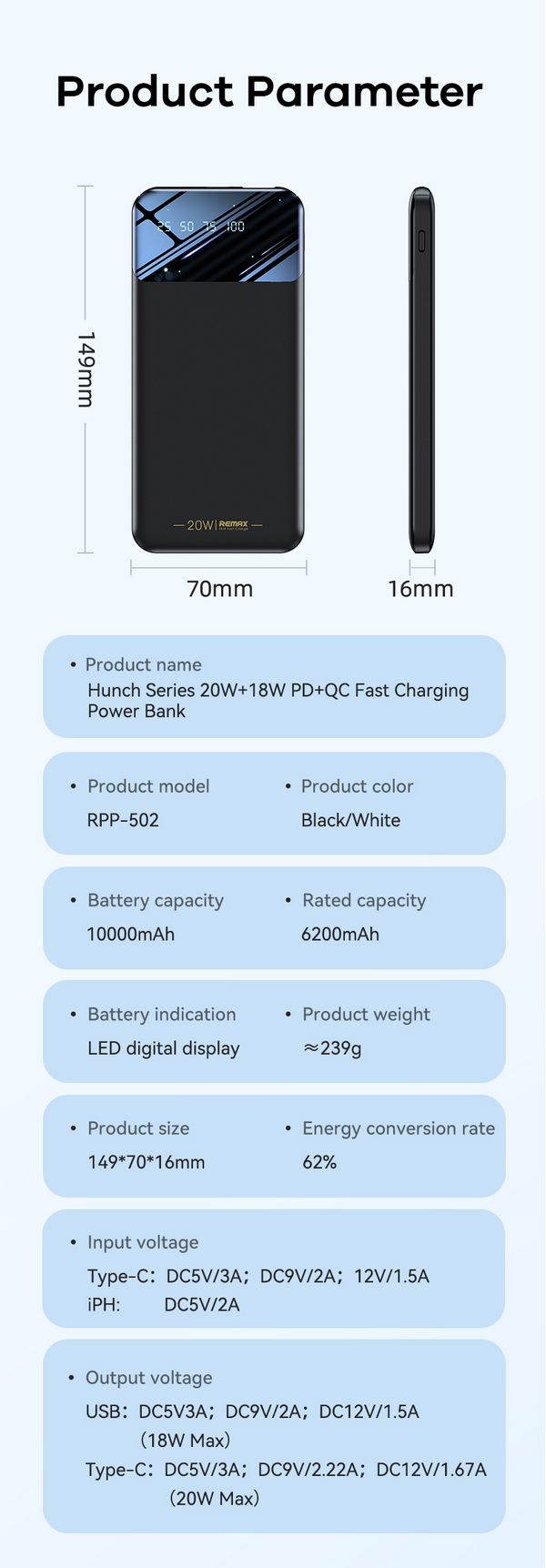 Pin sạc dự phòng REMAX RPP-502 10000mAh có thiết kế tinh tế với kết cấu đơn giản và phong cách với kích thước tối ưu: 149*70*16mm cùng khối lượng: 239g giúp bạn có thể dễ dàng mang đi bất cứ đâu.