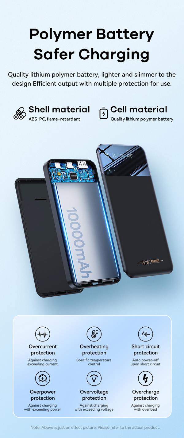 Với vật liệu chống cháy polymer và kỹ thuật sản xuất tiên tiến, pin sạc dự phòng REMAX RPP-502 10000mAh giúp sạc không bị quá nóng đảm bảo độ bền cao và hiệu suất ổn định trong suốt quá trình sử dụng.