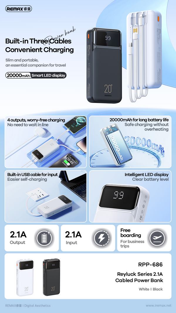 Pin sạc dự phòng REMAX RPP-686 20000mAh tích hợp 3 cáp 2.1A