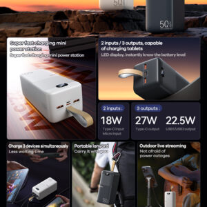 - Dung lượng lớn 50000mAh: Cung cấp năng lượng dồi dào, đủ để sạc nhiều thiết bị điện tử như smartphone, tablet, laptop và các thiết bị khác nhiều lần.