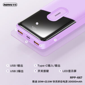 Remax RPP-667 được trang bị nhiều cổng sạc, bao gồm cổng USB và Type-C, cho phép sạc đồng thời nhiều thiết bị.