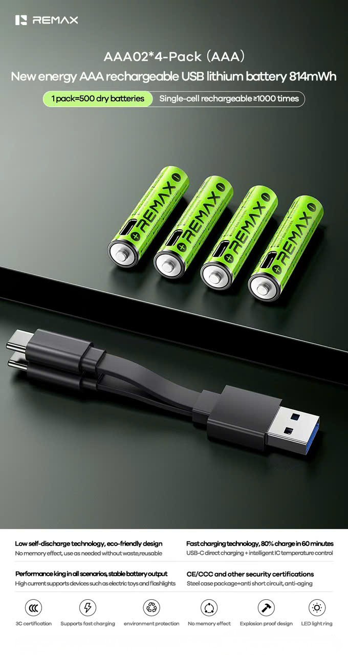 Giới thiệu REMAX New Energy AAA Rechargeable USB Lithium Battery 814mWh AAA01*2 packs, AAA02*4 packs