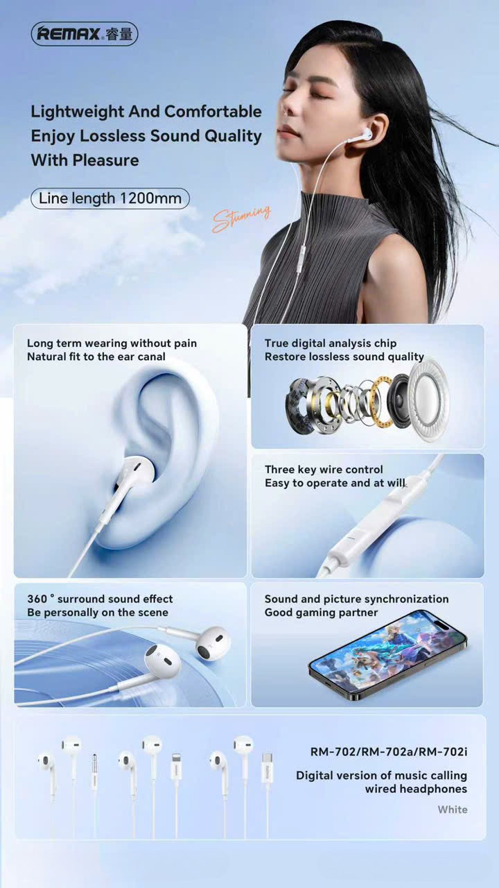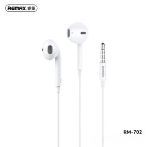 Tai nghe dây REMAX RM-702/a/i mang đến trải nghiệm âm thanh trung thực với thiết kế nhỏ gọn, ôm tai thoải mái. Jack cắm chuẩn 3.5mm/Lightning/Type-C (tùy phiên bản), tương thích nhiều thiết bị. Chất liệu dây bền bỉ, chống rối, thích hợp sử dụng hàng ngày cho học tập, giải trí và làm việc.