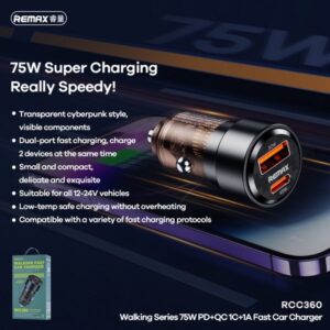 Tẩu sạc nhanh ô tô REMAX RCC360 75W PD+QC USB+Type C